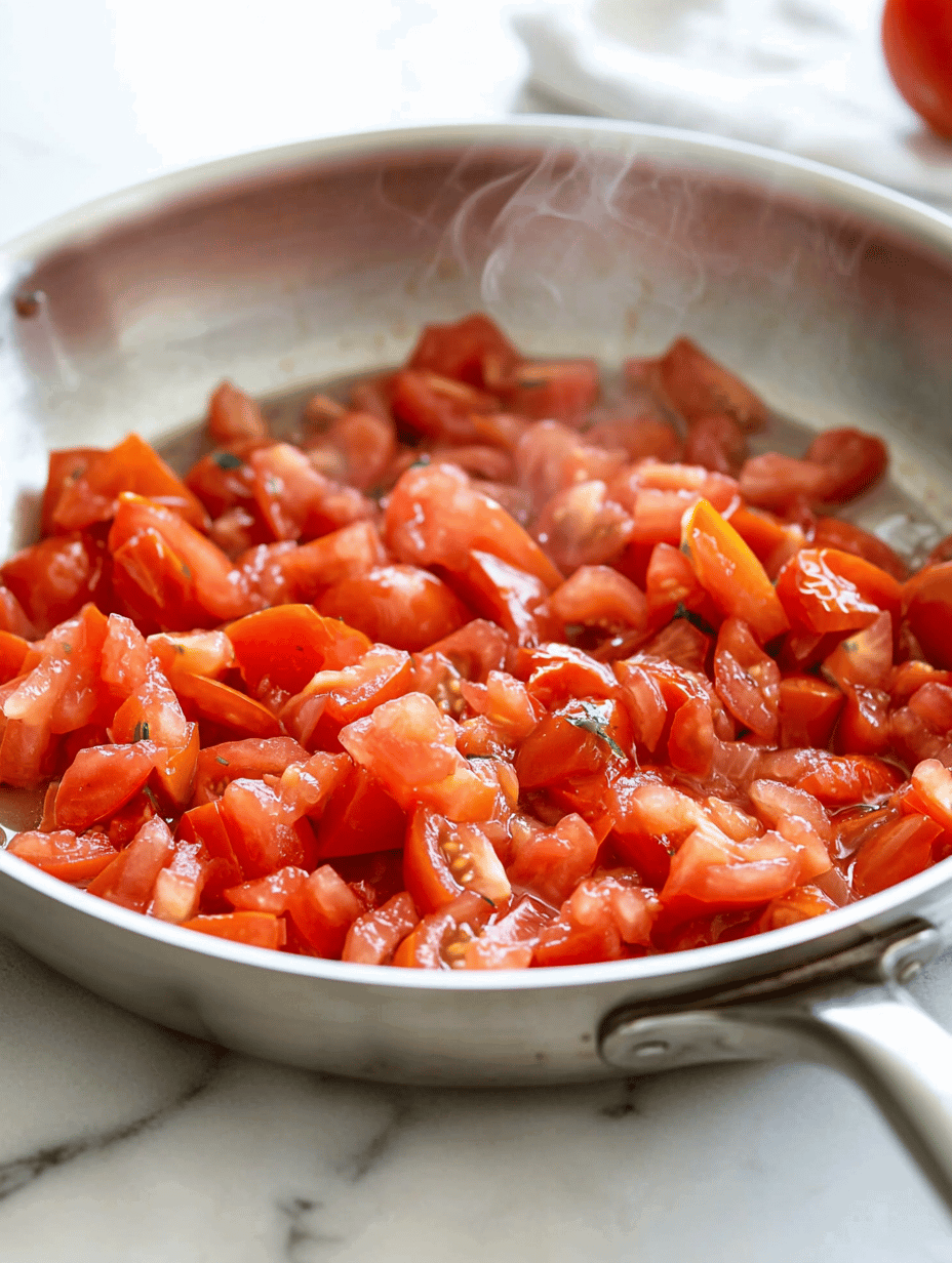 • Add the chopped tomatoes to the pan and cook until they start to break down and become saucy, about 8-10 minutes. Stir occasionally to prevent sticking and promote even simmering.