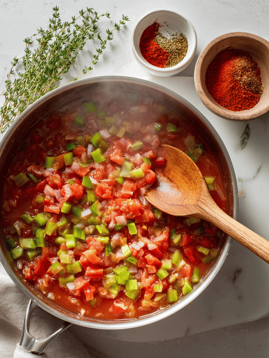 - Stir in garlic, paprika, cayenne, and thyme. Cook for 1 minute until spices bloom and release aroma.
