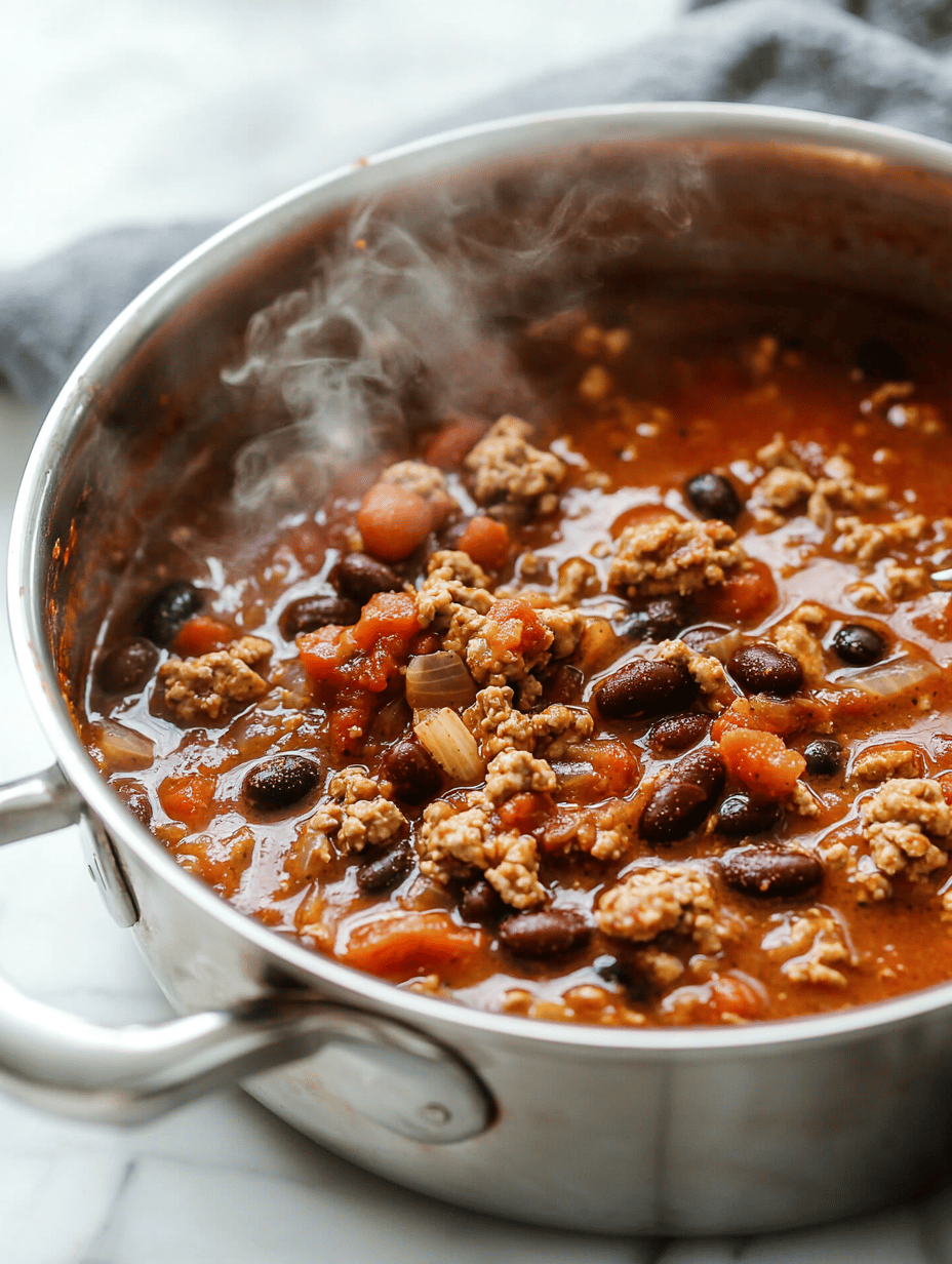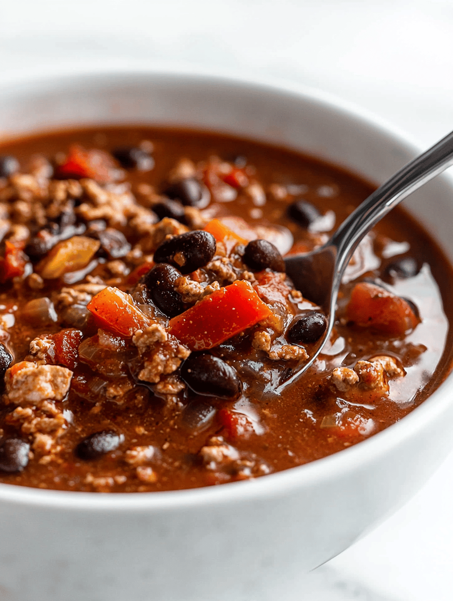 This turkey chili features ground turkey simmered with smoky spices, beans, and a hint of cocoa powder and espresso for added depth. The slow cooking process results in a thick, hearty stew with rich aroma and complex flavors, complemented by a vibrant, textured appearance. The dish showcases a balance of heat, umami, and warmth, with a smooth, chunky consistency.
