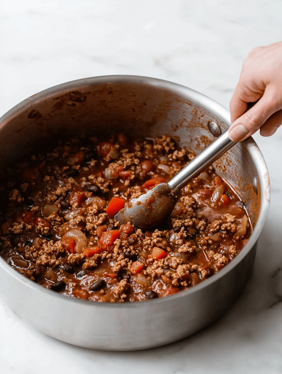 • Reduce the heat to low, cover the pot, and let the chili simmer gently for about 45 minutes, stirring occasionally to prevent sticking. The chili should thicken and develop rich, layered flavors.