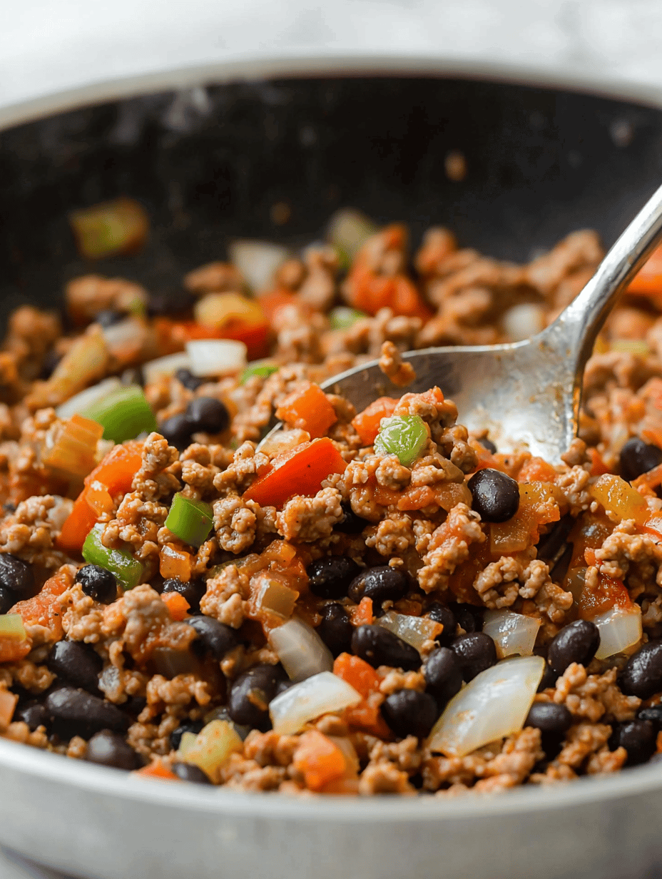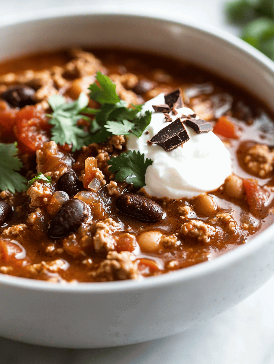 This turkey chili features ground turkey simmered with smoky spices, beans, and a hint of cocoa powder and espresso for added depth. The slow cooking process results in a thick, hearty stew with rich aroma and complex flavors, complemented by a vibrant, textured appearance. The dish showcases a balance of heat, umami, and warmth, with a smooth, chunky consistency.