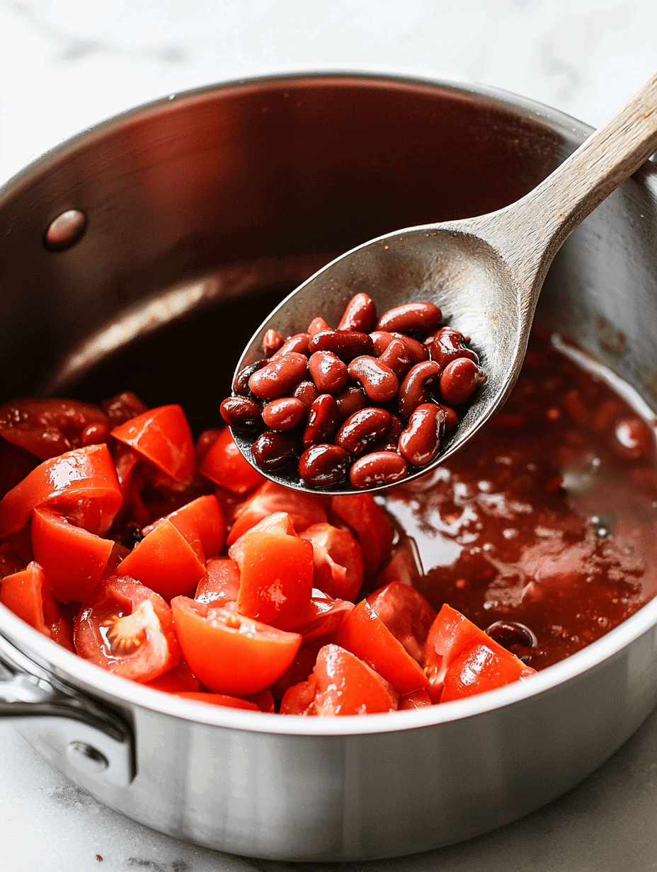 • Pour in the diced tomatoes with their juice, the drained kidney beans, and the espresso shot. Stir everything together and bring to a gentle simmer.