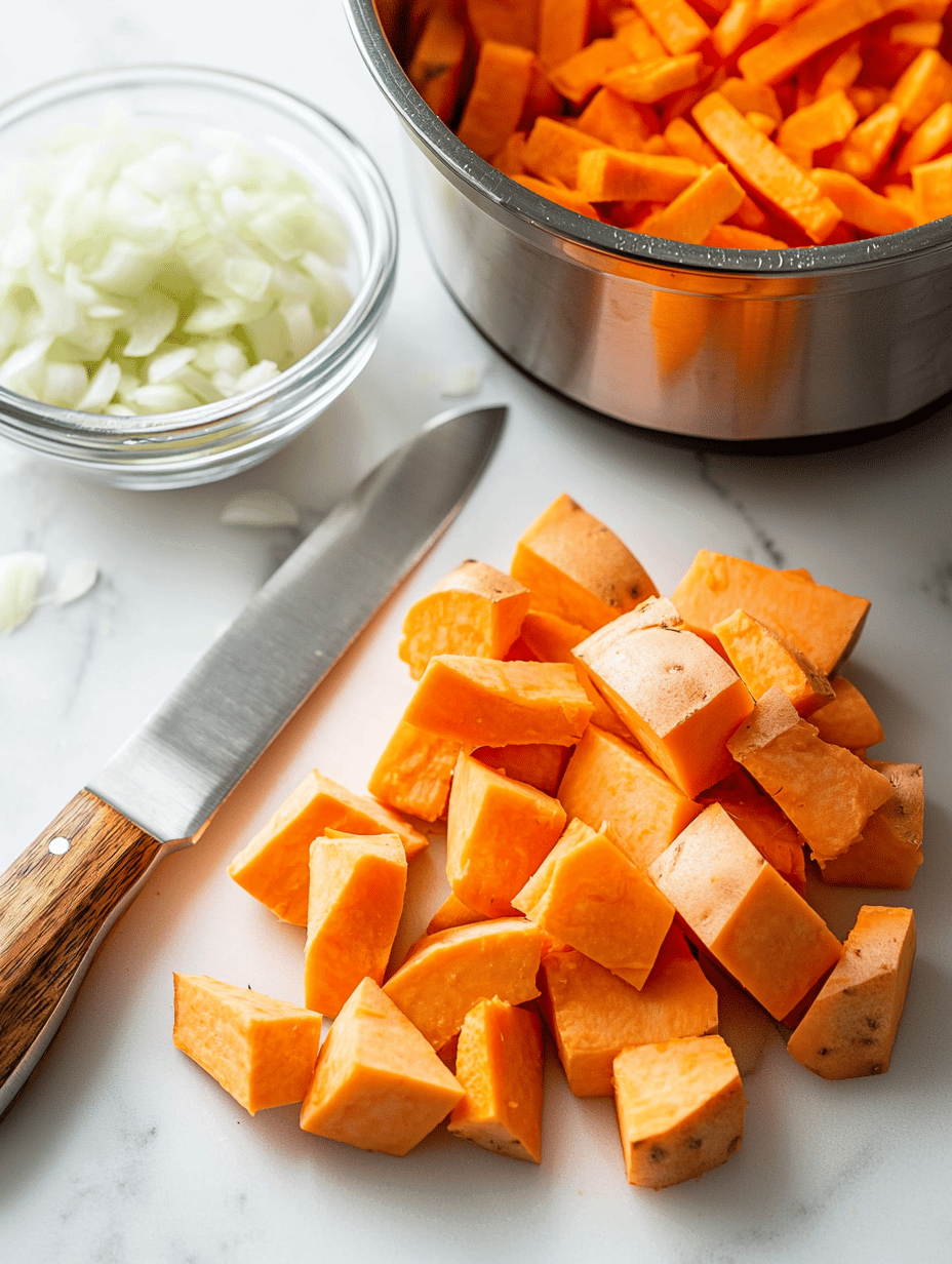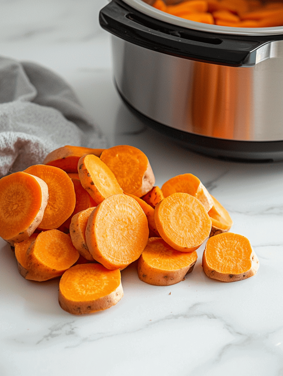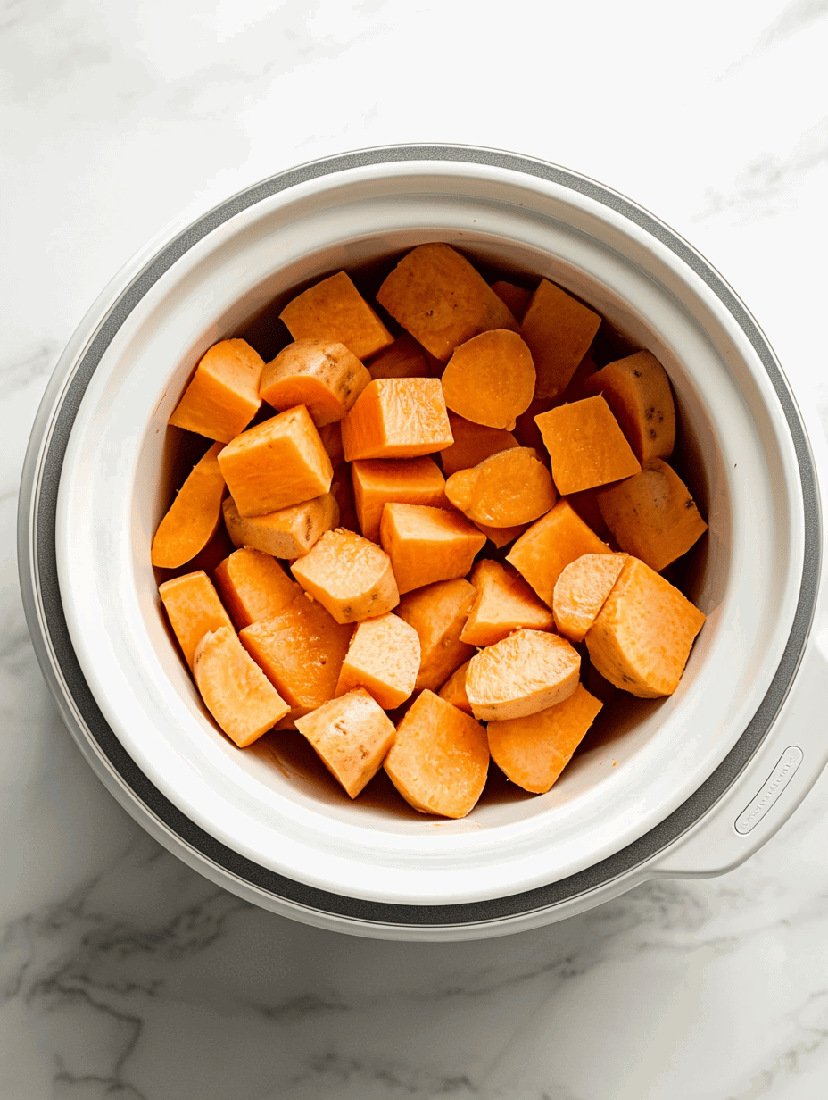 - Peel and chop the sweet potatoes into uniform pieces for even cooking and place them in the slow cooker.