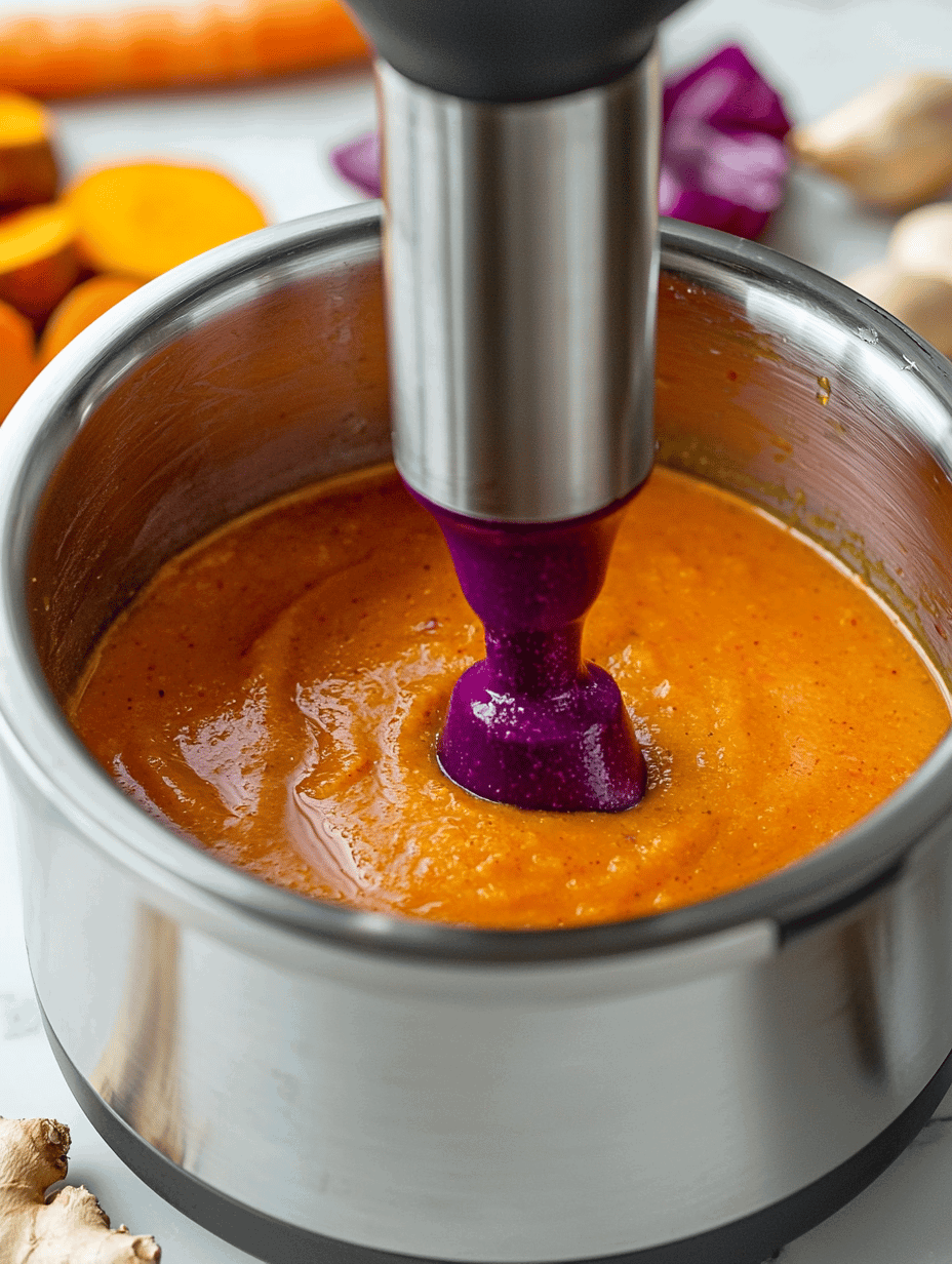 - Once cooked, use an immersion blender directly in the slow cooker or transfer the mixture to a blender. Puree until the soup is smooth and velvety.