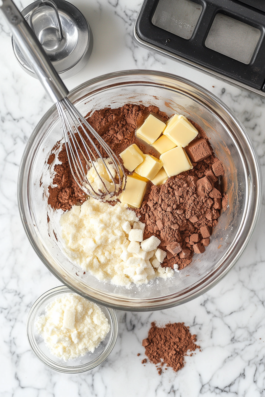 - Add cocoa powder, brown sugar, and granulated sugar to the bowl; whisk until mixed well.