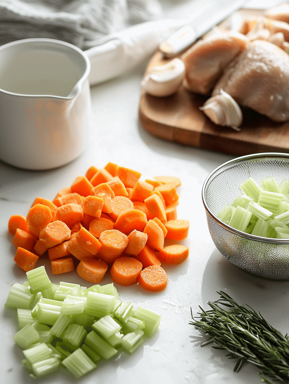 - While the chicken cools slightly, chop the vegetables: slice carrots, celery, and dice the onion.