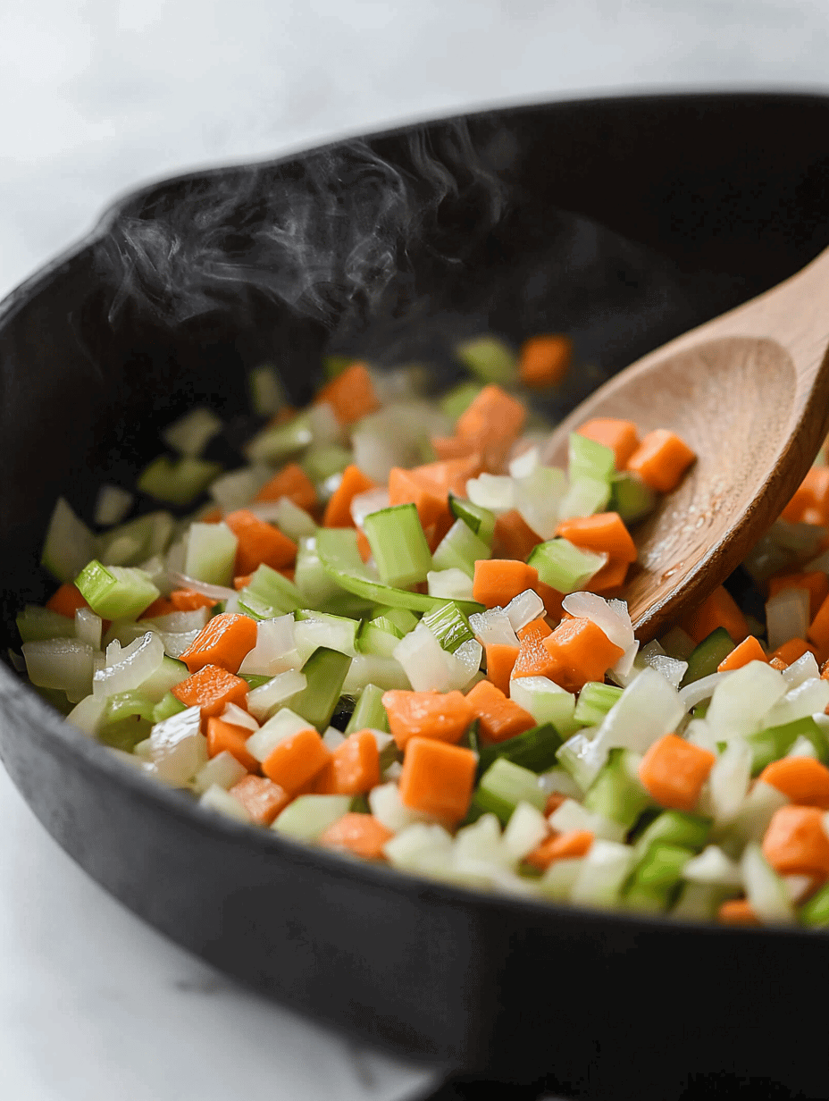 - Add the chopped onion, carrots, and celery to the same skillet and cook for 3-4 minutes, stirring occasionally, until they start to soften and develop some color.