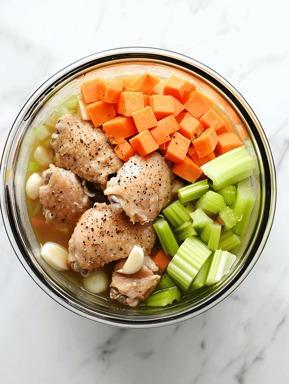 - Pour the vegetables into the crockpot, then add the garlic, broth, and seared chicken thighs on top.