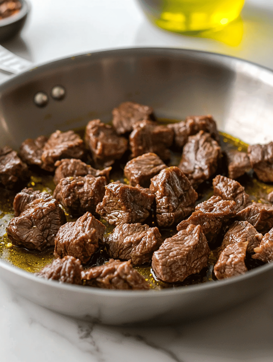 - Heat a large skillet over medium-high heat and add olive oil. When shimmering, add the beef chunks and sear until browned on all sides, about 5 minutes, to develop flavor. Transfer the browned beef to the slow cooker.
