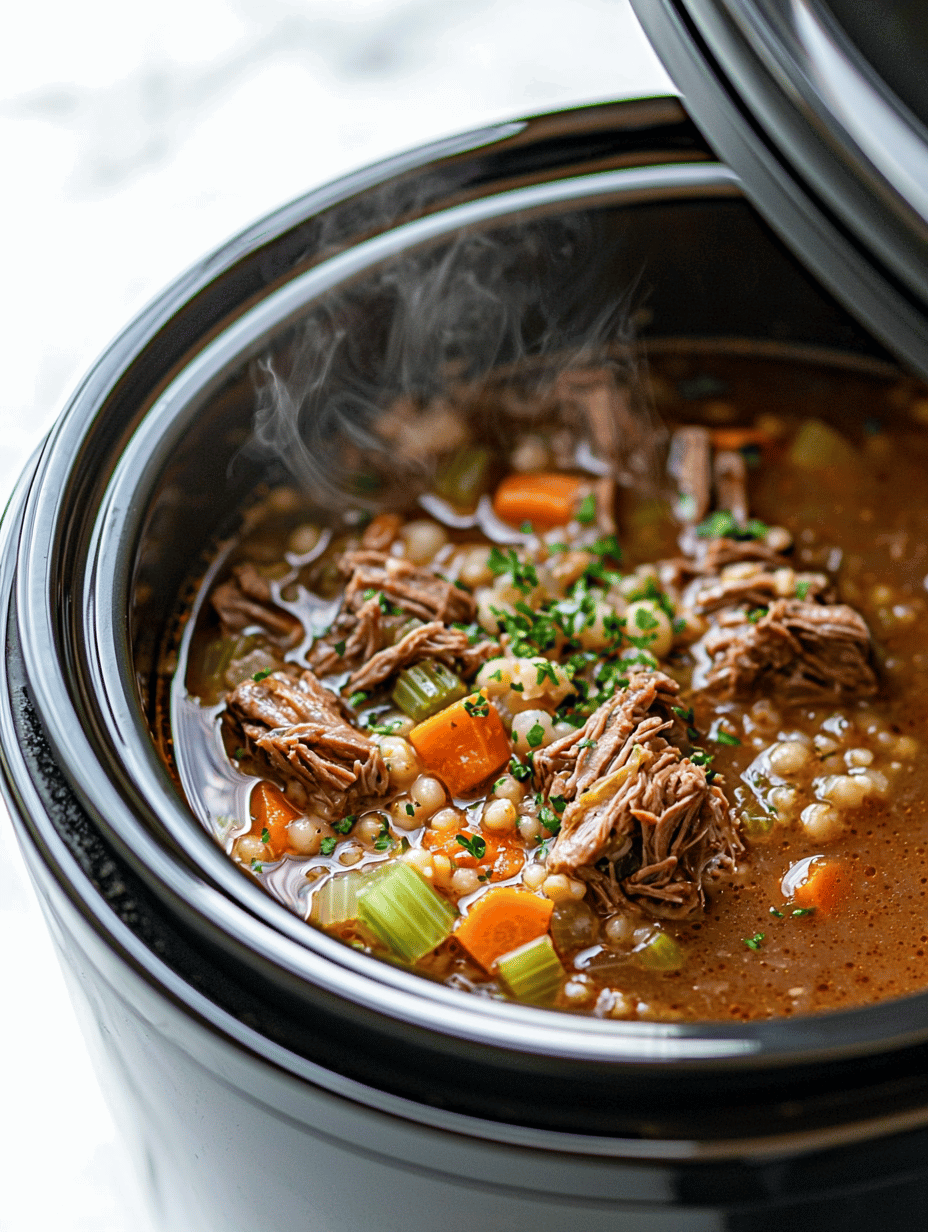 - Cover the slow cooker with its lid and set to low heat. Let it simmer for about 4 hours, or until the beef is tender and easily shredded, and the barley is soft but still chewy.