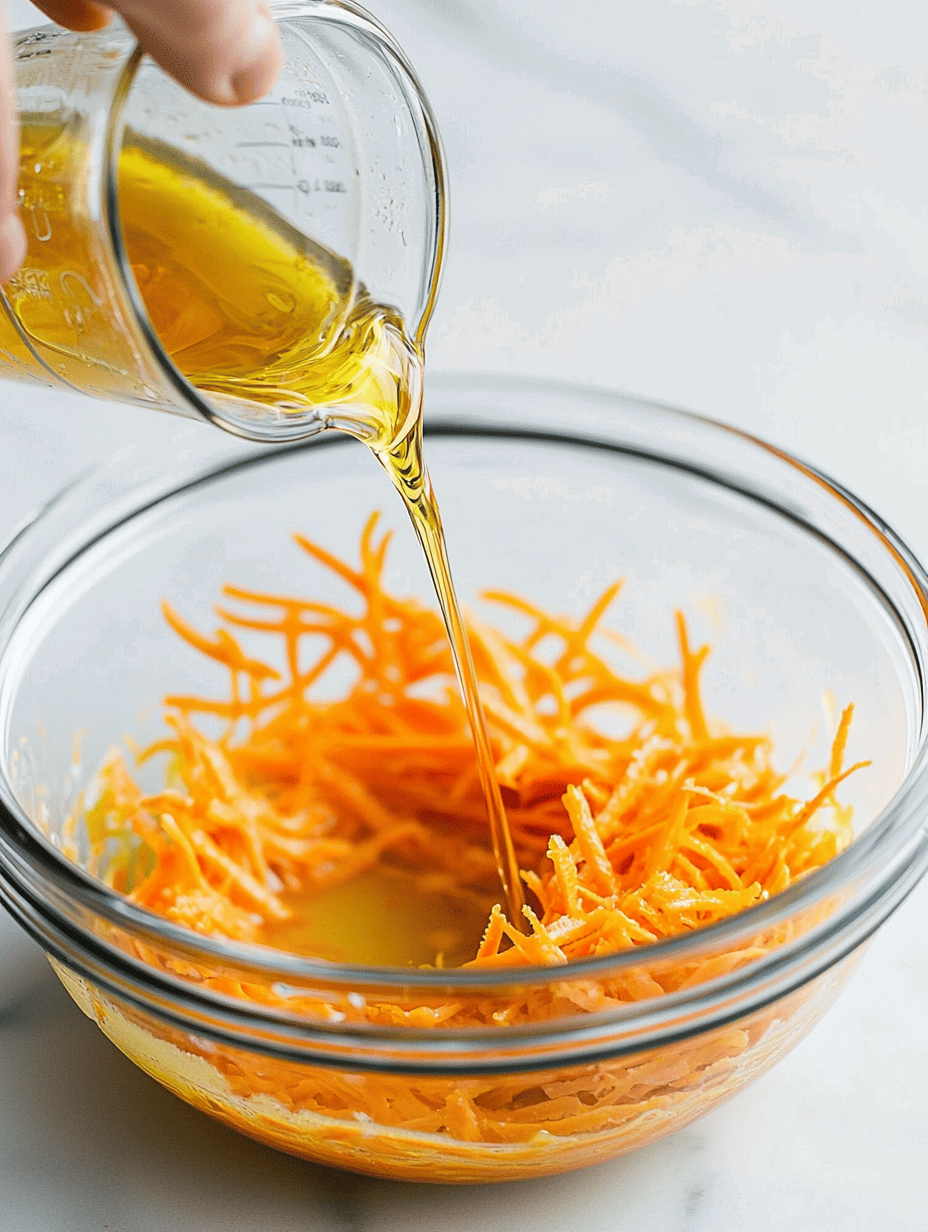 • Slowly pour in the oil while whisking, blending everything into a uniform, slightly shiny batter.
