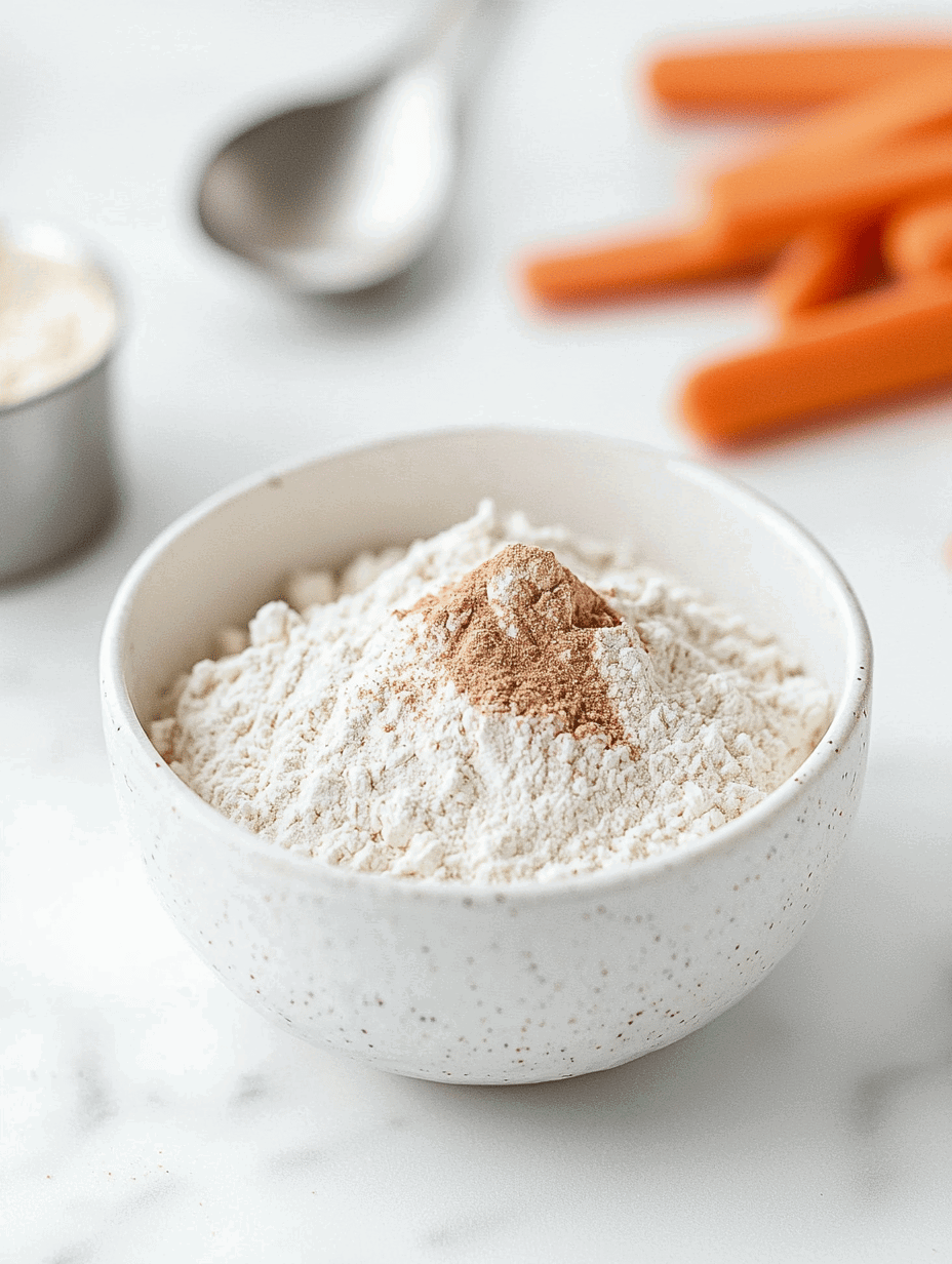 • In a separate small bowl, whisk together the flour, cinnamon, baking powder, and baking soda. Sift if desired for a smoother batter.