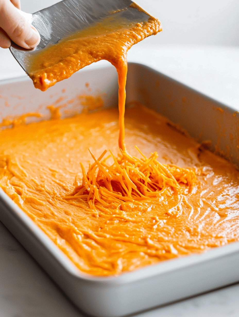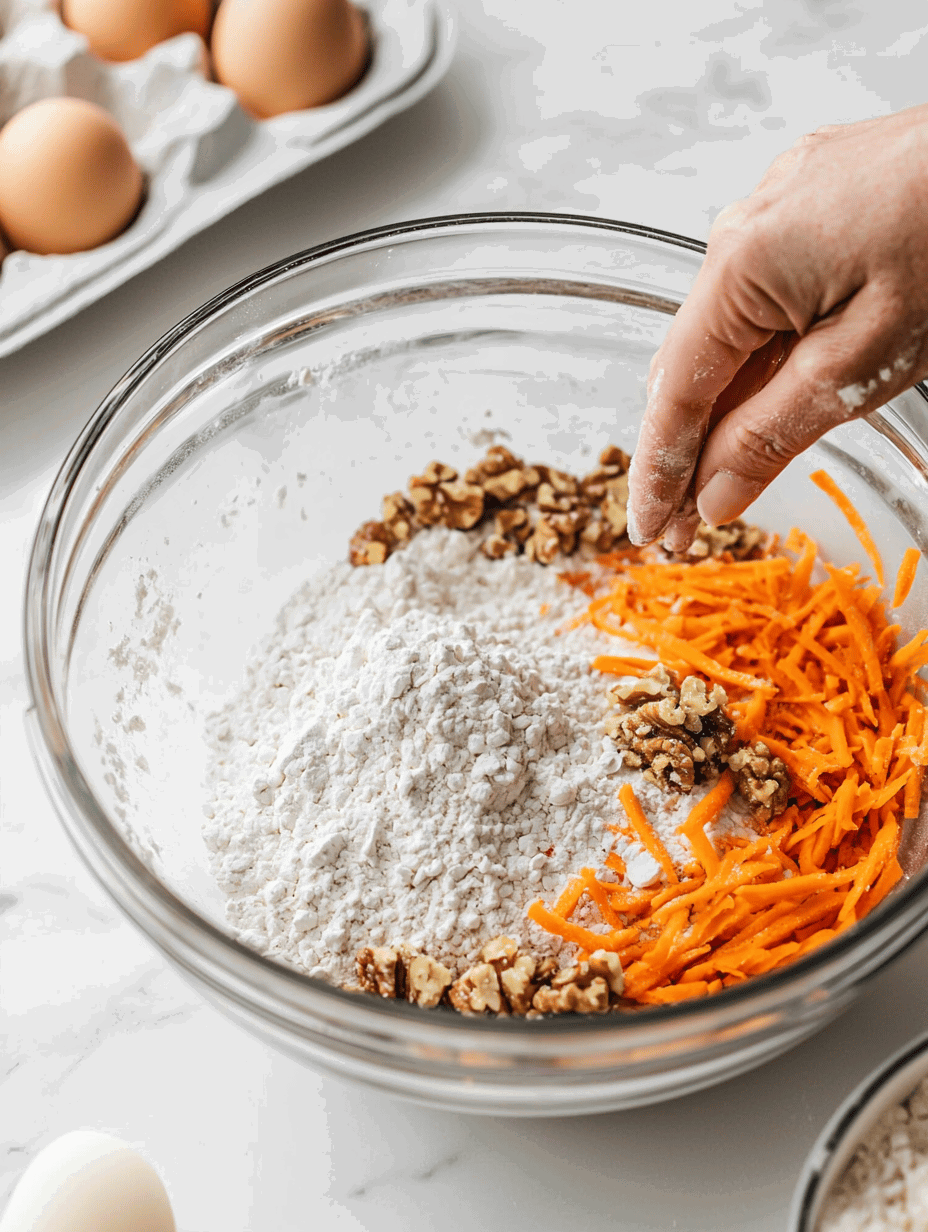• Fold in the grated carrots gently with a spatula, making sure they are evenly distributed without deflating the mixture.