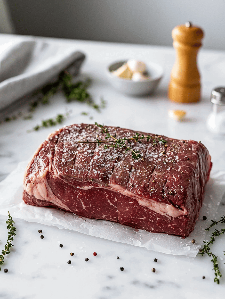 • Pat the beef roast dry with paper towels to remove excess moisture, then generously season all over with salt, pepper, garlic, and thyme, pressing the seasonings into the meat.