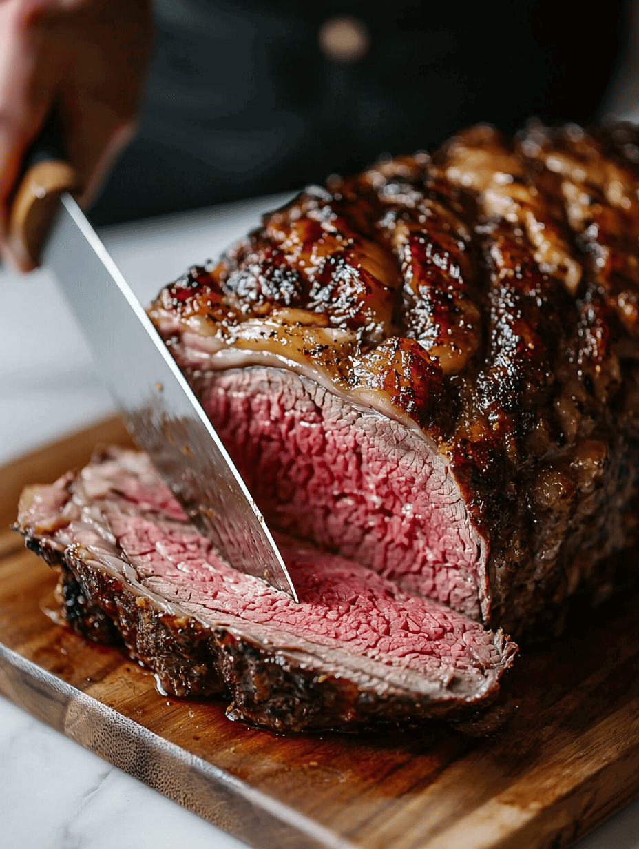 • Slice the prime rib against the grain into thick slices, showcasing a beautifully tender and evenly cooked interior with a crisp, browned exterior.
