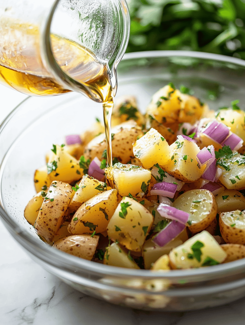 - Add the finely chopped red onion and fresh parsley to the potatoes. Pour the dressing over and gently toss to coat all the potatoes evenly, allowing the flavors to meld.