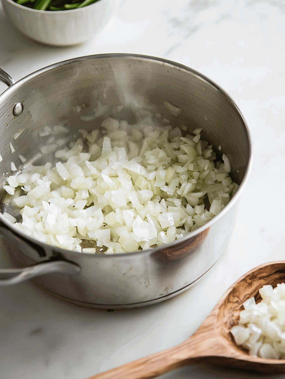 - Heat a large pot over medium heat and add a splash of oil. When shimmering, add chopped onions and cook until translucent, about 5 minutes, until they smell sweet and look glossy.