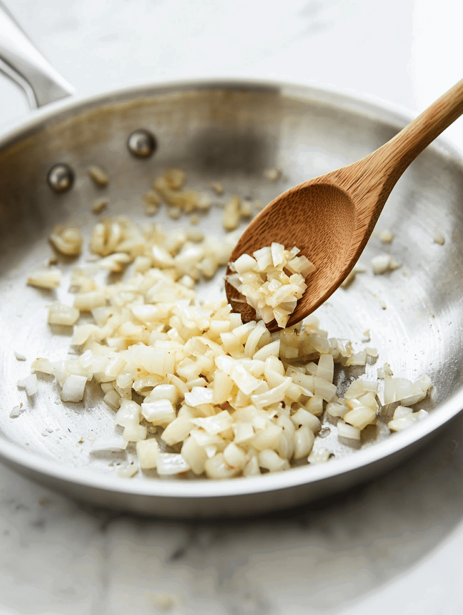 - Add the minced garlic to the onions and cook for another minute, stirring constantly; it should become fragrant and slightly golden.