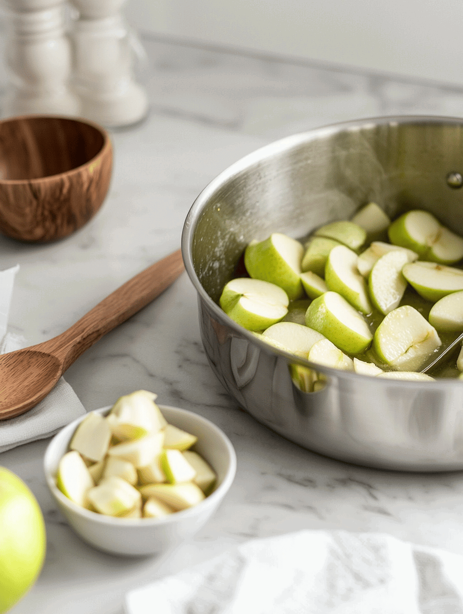 • Start by heating your large pot over medium heat and add the olive oil or butter. Once melted and fragrant, toss in the chopped apples and sauté until they begin to soften and release their aroma, about 5 minutes.
