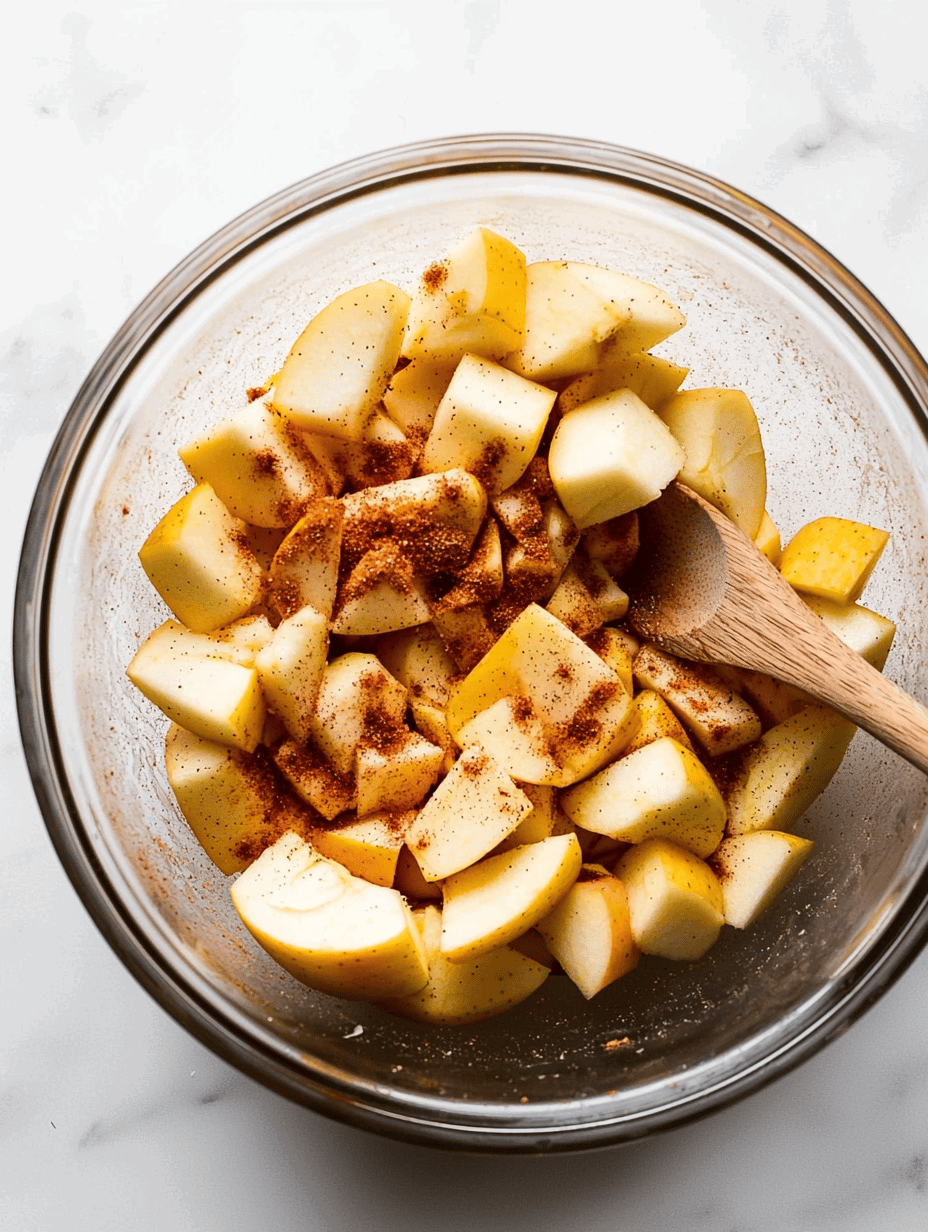 • Sprinkle the ground cinnamon, red chili flakes, and a pinch of salt over the apples. Stir well to coat the fruit evenly with the spices, allowing the mixture to become fragrant and spicy sense of aroma to fill the kitchen, about 1 minute.