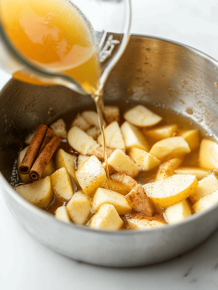 • Pour in 3 cups of vegetable or apple cider and bring the mixture to a gentle simmer. Reduce the heat to low, cover partially, and let it simmer for about 15 minutes until the apples are very soft and easily mashed.