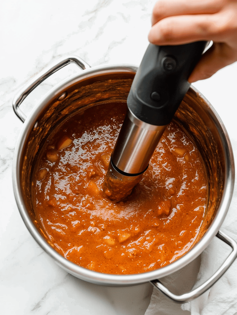 • Use an immersion blender directly in the pot to puree the mixture until smooth, or carefully transfer it to a blender in batches and blend until velvety. Return the blended soup to the pot if using a regular blender.