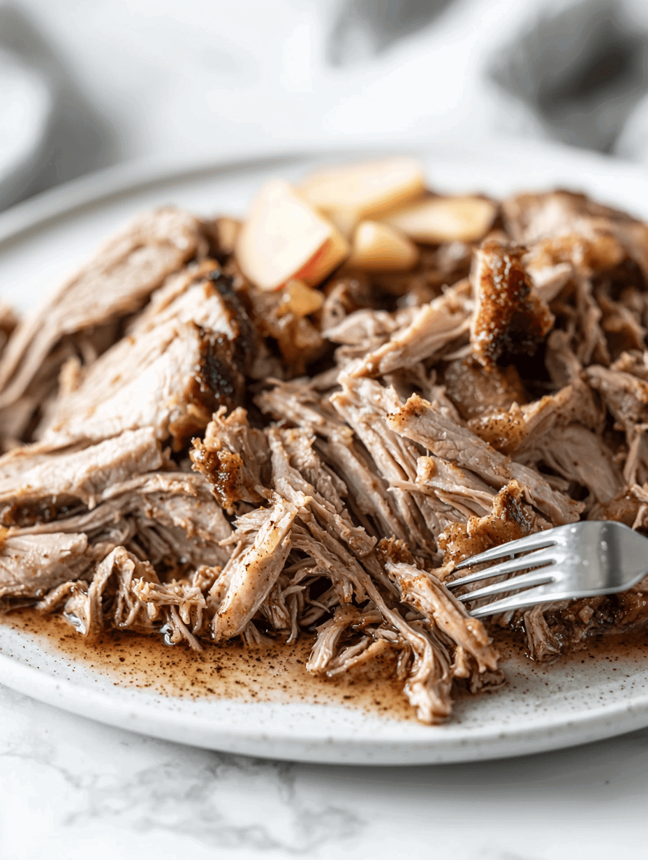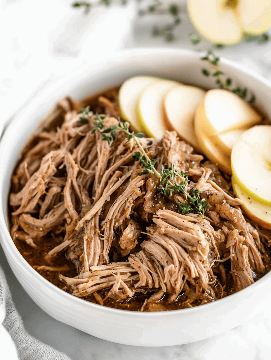- Cover and cook on low for 6 hours, or until the pork is tender and can be easily shredded with a fork. The house will fill with a rich, spicy apple aroma.