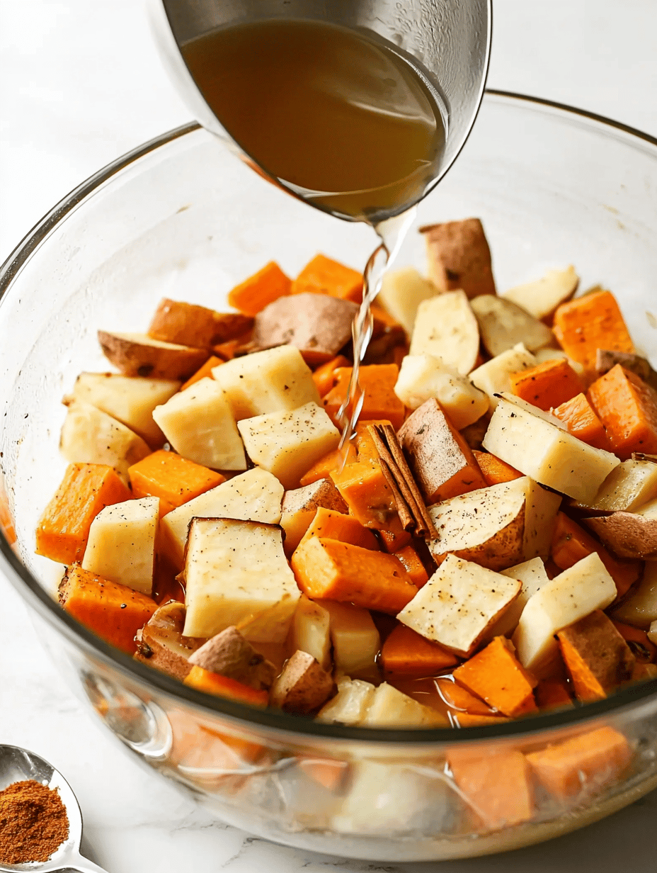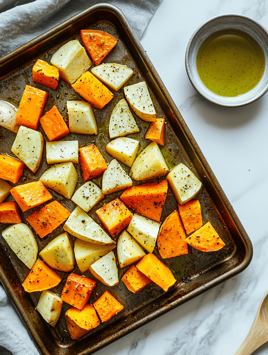 - Preheat your oven to 400°F (200°C). Toss the parsnips, kabocha squash, and sweet potatoes with a tablespoon of olive oil, then spread them evenly on a baking sheet.
