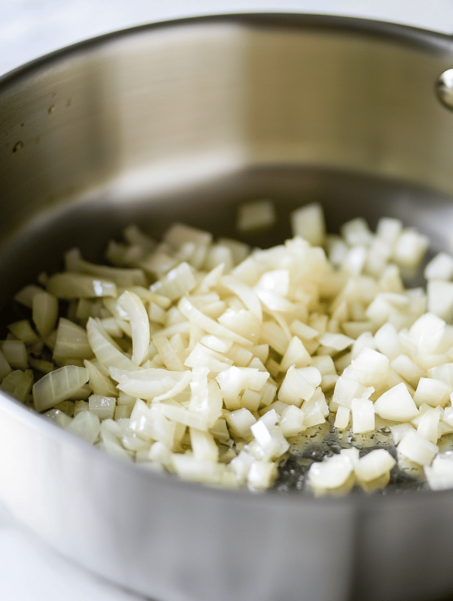 - While the vegetables roast, heat a tablespoon of olive oil in a large pot over medium heat. Add the chopped onion and cook, stirring occasionally, until it becomes soft and translucent, about 5 minutes. Add the minced garlic and cook for another minute until fragrant.
