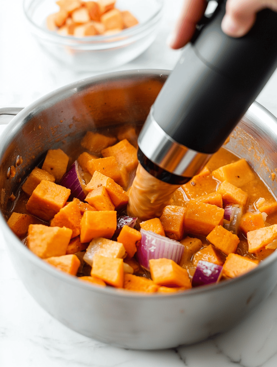 - Use an immersion blender directly in the pot or transfer the soup in batches to a blender. Puree until smooth and creamy, then return it to the pot. If the soup is too thick, stir in a little hot water or additional broth to reach your desired consistency.