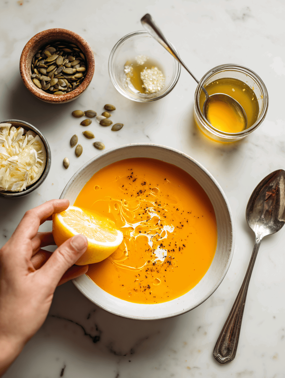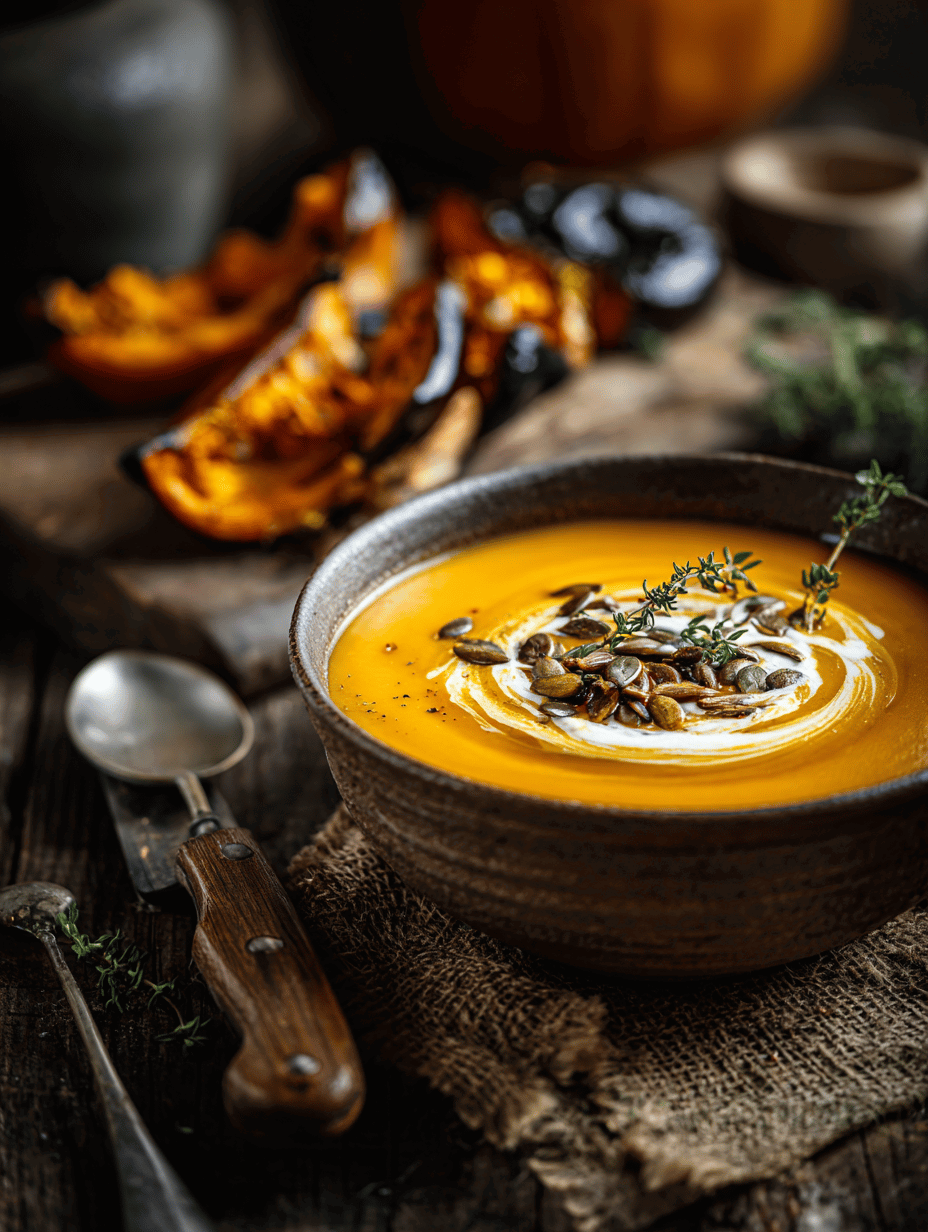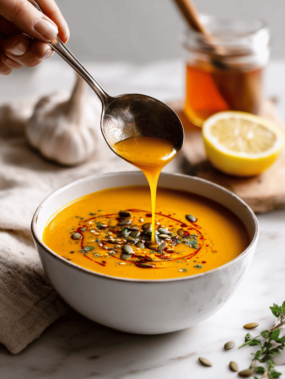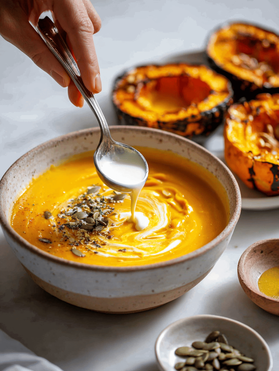 - Ladle the hot soup into bowls, garnish with a drizzle of coconut cream, and sprinkle with toasted pumpkin seeds for crunch and nuttiness.