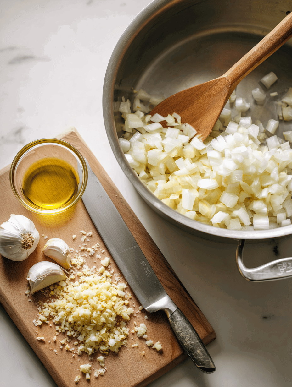 Step 4: While pumpkin roasts, sauté diced onion and minced garlic in a large pot with a splash of olive oil until translucent.