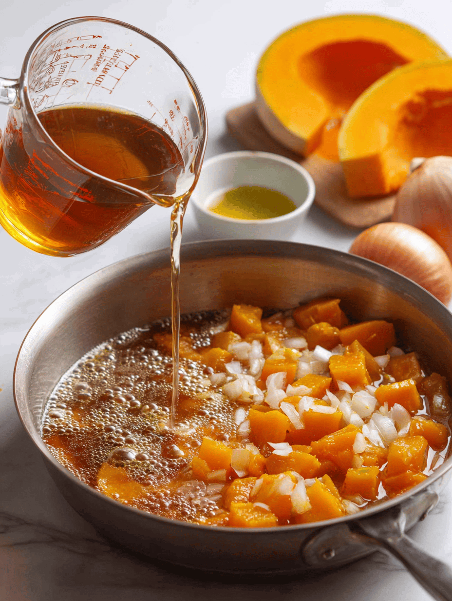 Step 6: Scoop roasted pumpkin flesh into the pot, pour in vegetable broth, and bring to a simmer.