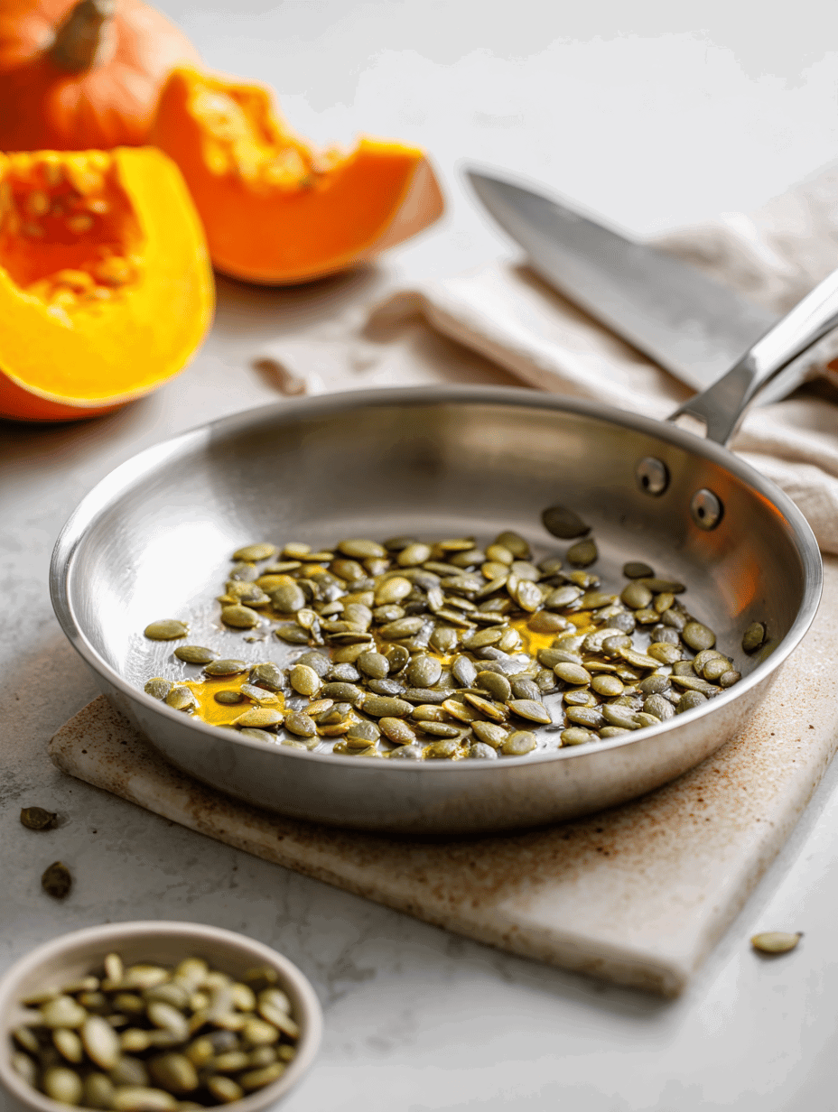 - Meanwhile, toast the pumpkin seeds in a dry skillet over medium heat until golden and fragrant, about 3-4 minutes.