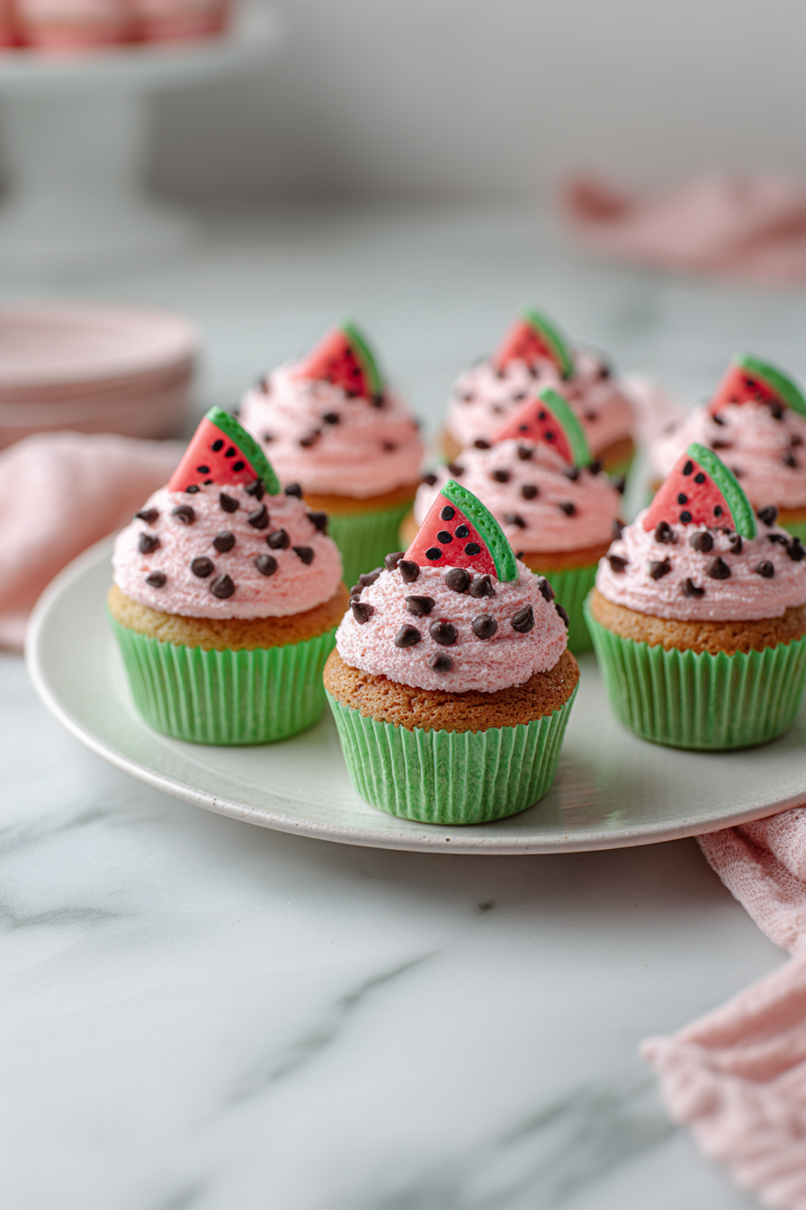 I first made these during a Fourth of July weekend when I wanted something festive, fun, and not too heavy. The sour cream in the cupcake base keeps them incredibly moist, while the light green hue and mini chocolate chips give the full illusion of a watermelon slice.