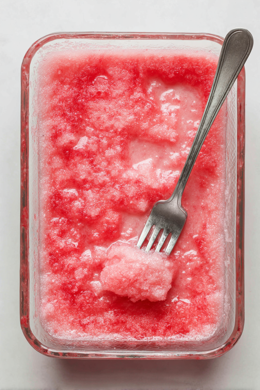 Ans: After about an hour in the freezer, you’ll notice the edges start to harden. That’s your cue to scrape with a fork. Repeat every 30–45 minutes until the whole tray turns into fluffy, icy crystals. It usually takes around 3 to 4 hours. If it feels light and flakes easily, it’s ready to serve.