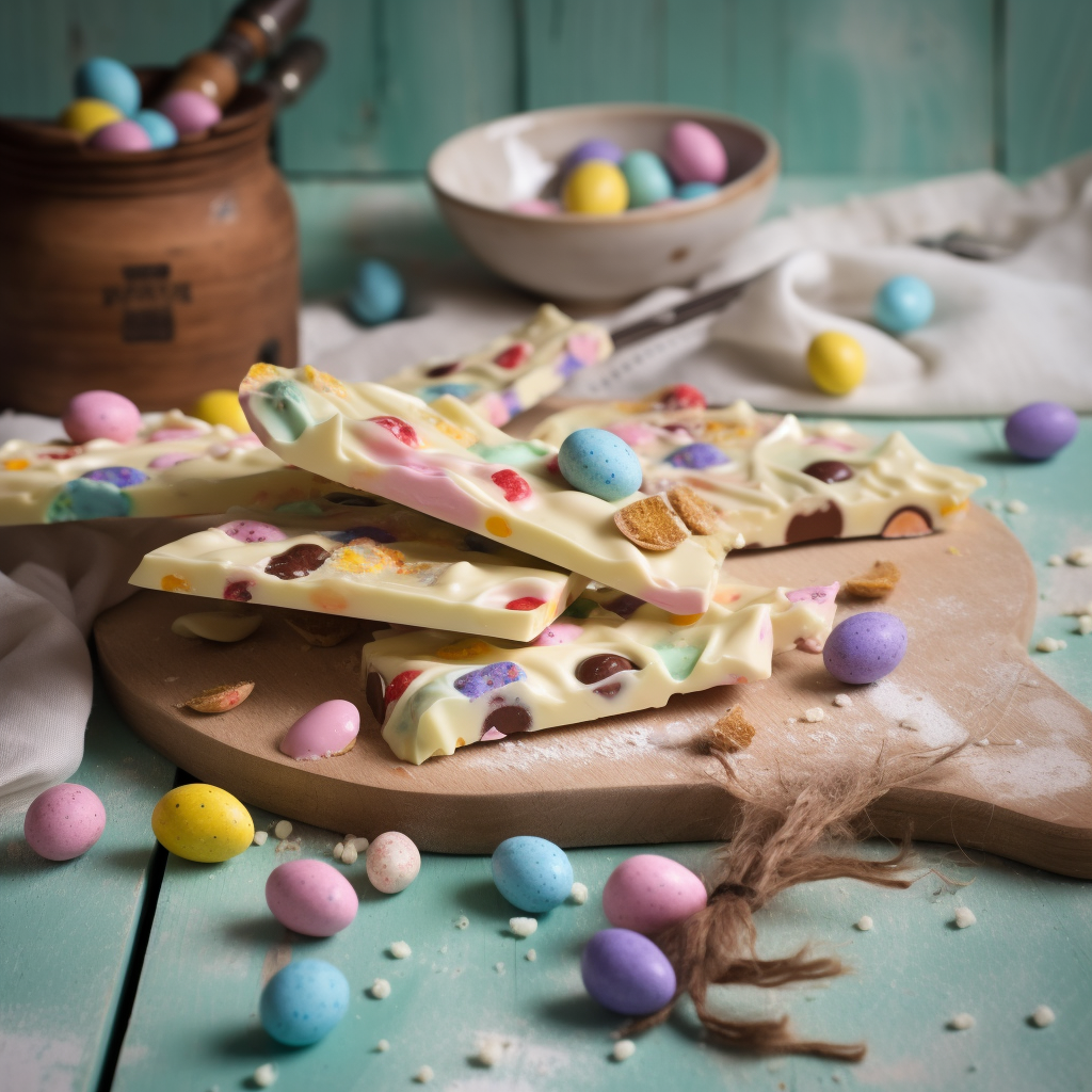 Easter bark is a sweet treat popular during the Easter holiday. It’s made by melting chocolate, usually white or milk chocolate, and spreading it out onto a baking sheet. Then, colorful Easter-themed candies like pastel-colored M&M’s, mini chocolate eggs, sprinkles, or marshmallows are scattered on top of the melted chocolate. Sometimes, shredded coconut or chopped nuts are added for extra flavor and texture. Easter bark is a fun and festive treat that combines the richness of chocolate with the cheerful colors and flavors of Easter candy, making it a delightful addition to Easter celebrations or a tasty homemade gift for friends and family.