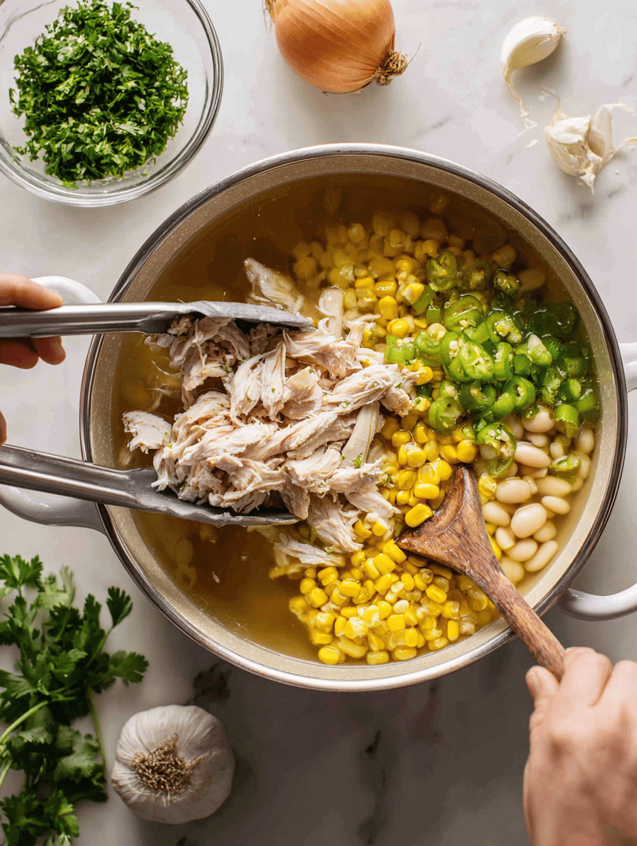 4. Remove chicken, shred with forks or tongs. Return to the pot, add beans, corn, and broth. Bring everything to a gentle simmer—about 10 minutes—until the flavors meld and the broth is slightly thickened.