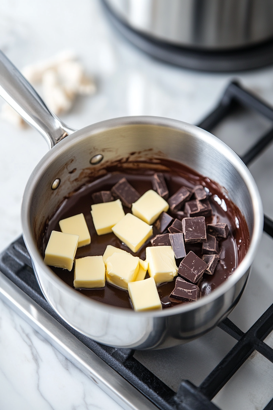 Melt butter and chocolate in a small saucepan over low heat, stirring constantly. Set aside.