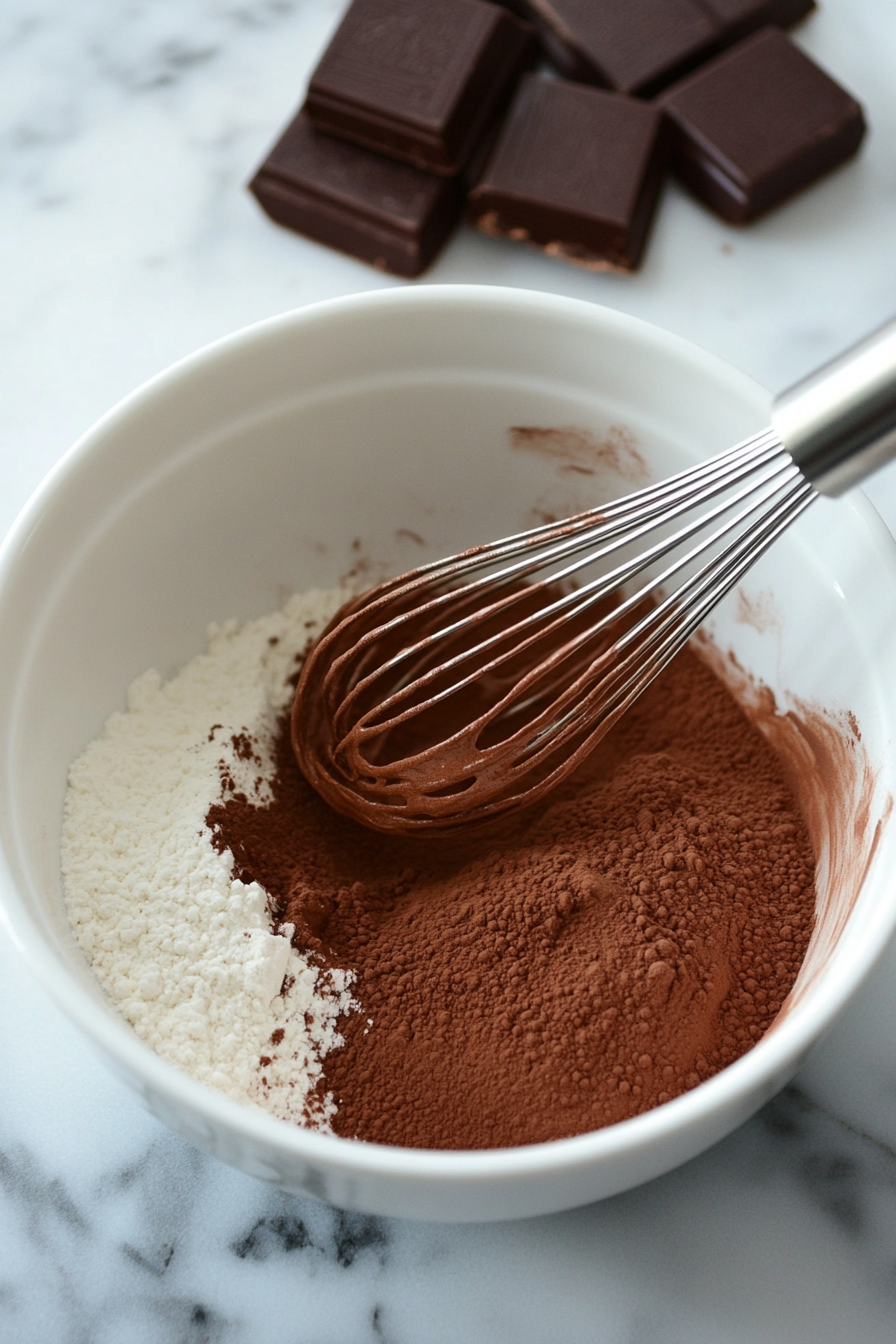Mix dry ingredients in a bowl, then gently fold them into the chocolate mixture until just combined. Scrape the bowl to ensure everything is mixed.