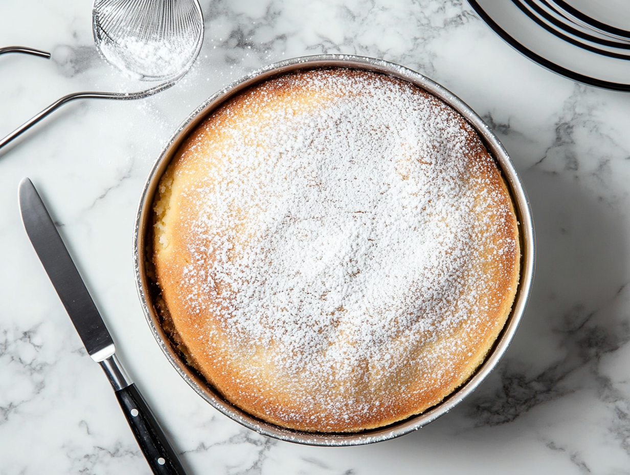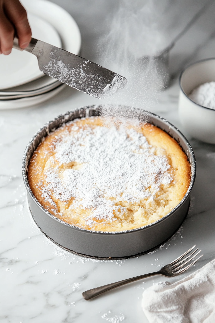 Cool the cake for 20-30 minutes, dust with powdered sugar, slice, and serve.