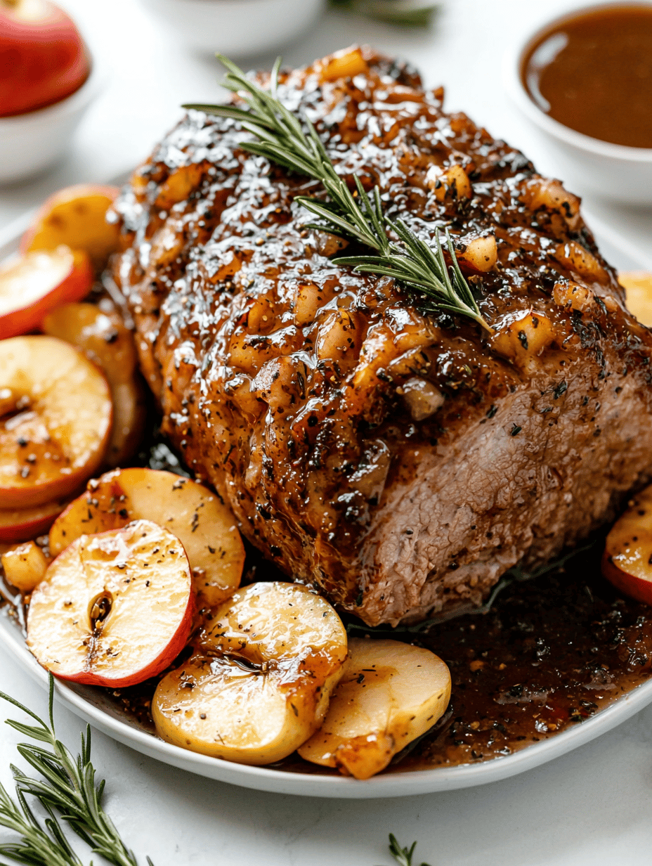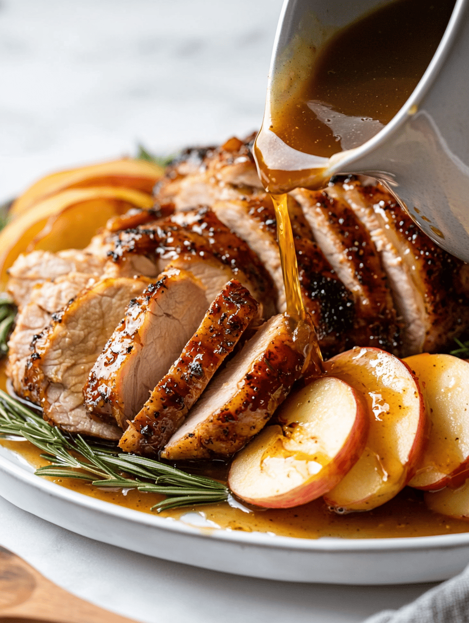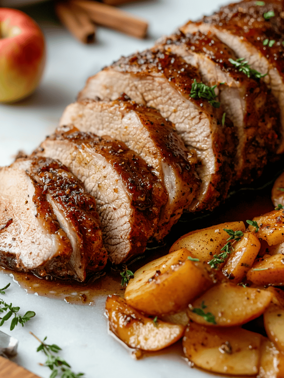 Slice the rested pork roast into thick, tender slices. Arrange on a serving platter with the cooked apples.
