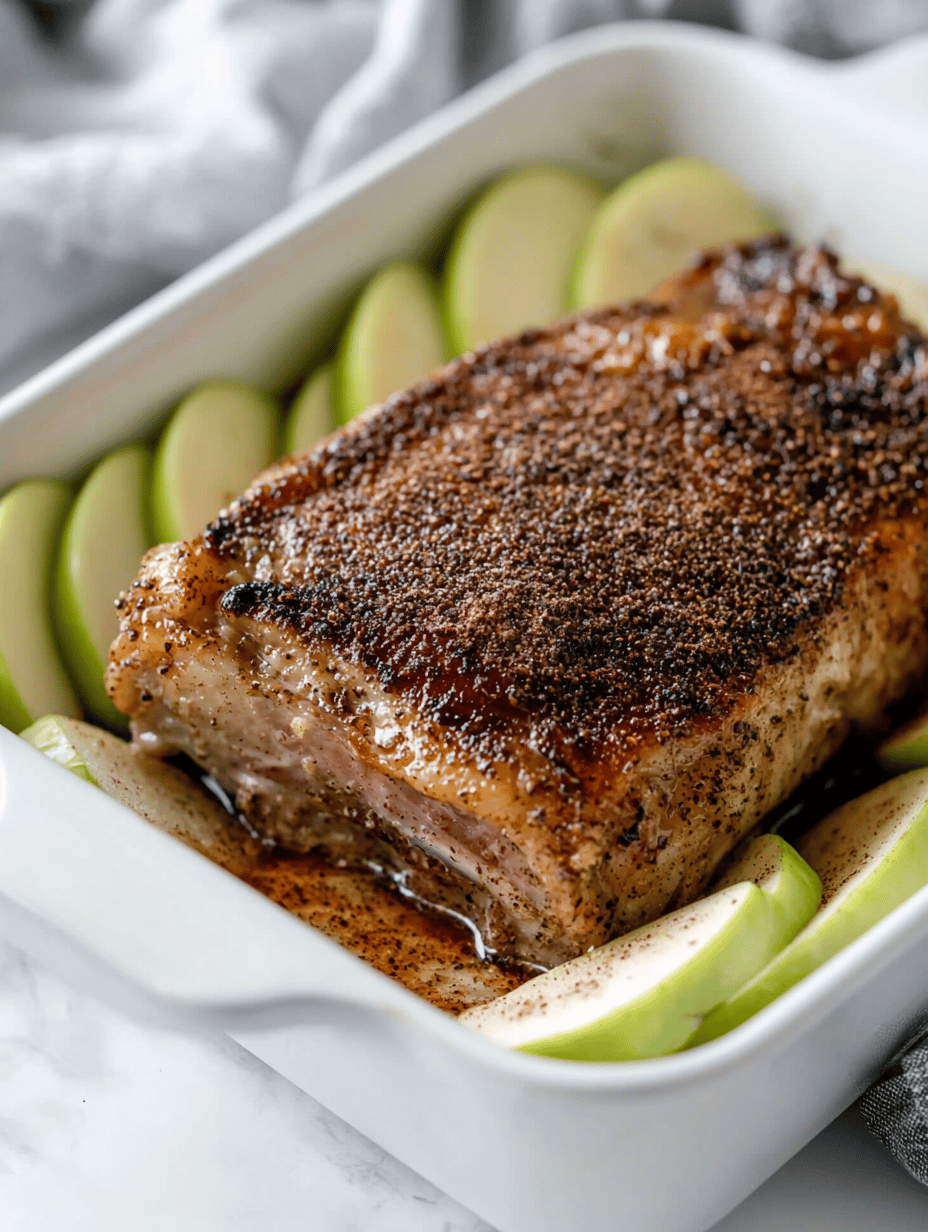 Transfer the seared pork to a roasting pan or baking dish. Add the sliced apples around the pork, then sprinkle with cinnamon, salt, and black pepper for seasoning.