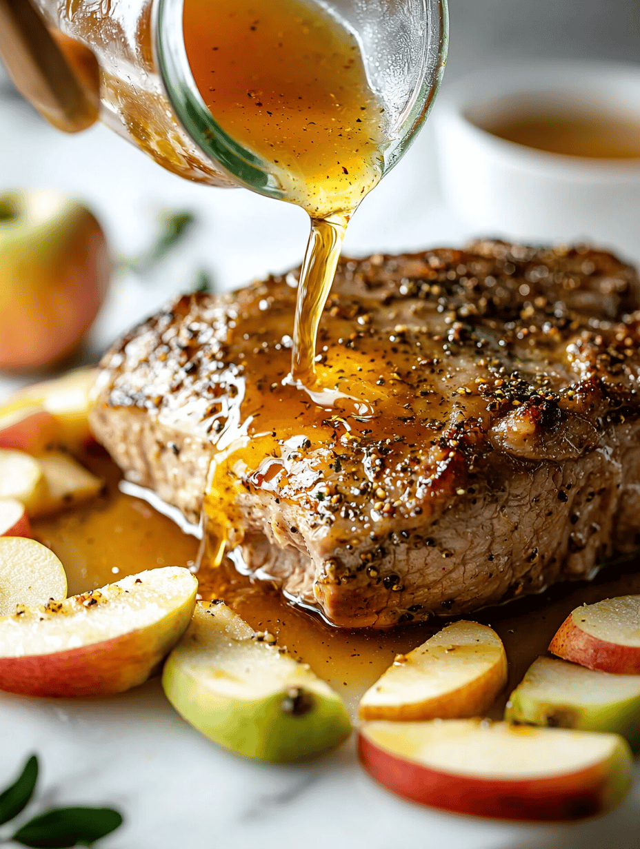 Pour the warm cider sauce over the sliced pork and apples. Serve the dish while still warm, enjoying the rich, seasonal flavors and juicy textures.