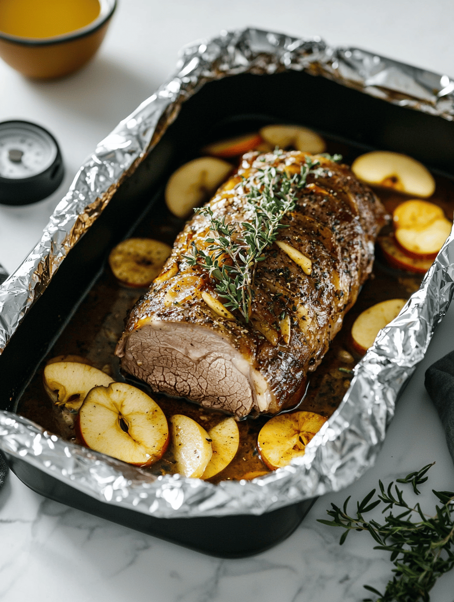 Cover the dish tightly with foil and place in the preheated oven. Roast for about 2.5 to 3 hours, or until the pork is tender and easily pulls apart when pierced with a fork. The house will fill with a cozy cider aroma as it cooks.