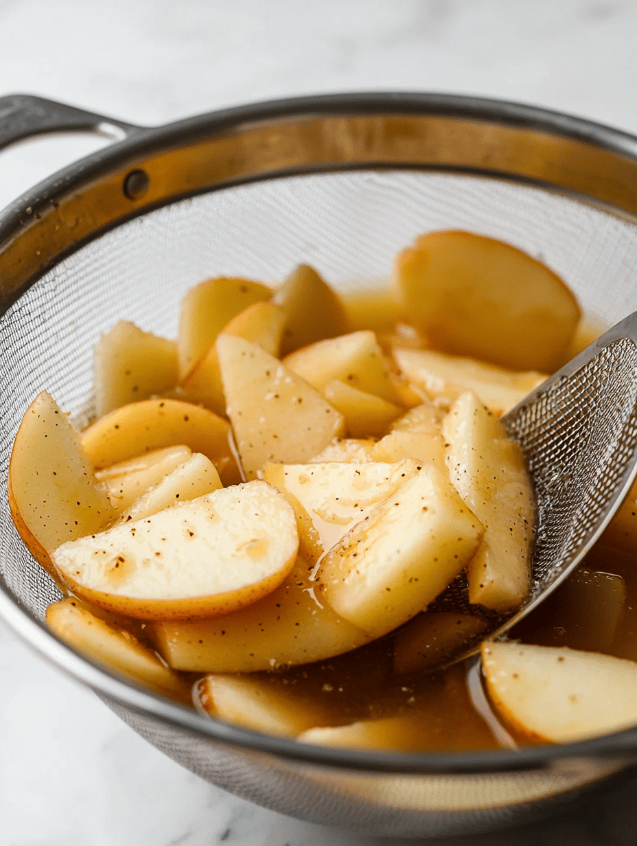 Meanwhile, strain the cooking liquid into a saucepan, pressing on the apples to extract all the flavorful liquid. Bring this to a gentle simmer over medium heat.