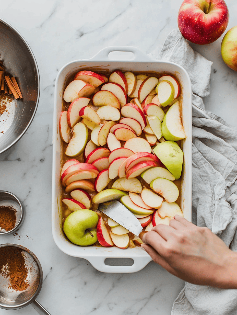 Arrange the sliced apples evenly in the prepared baking dish as the first layer, creating a colorful base.