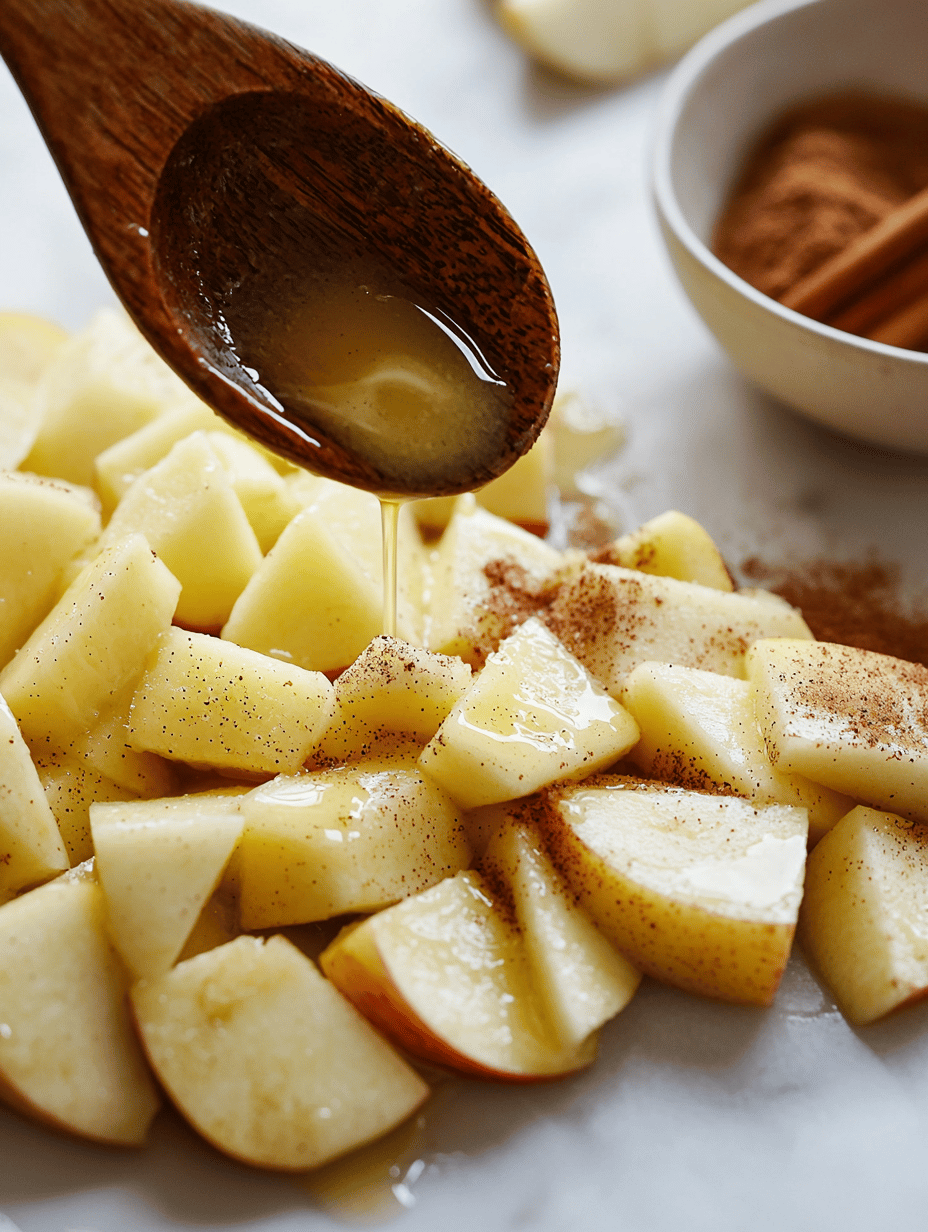 Drizzle the melted butter over the apples, then sprinkle with brown sugar and cinnamon to coat them evenly and bring out their sweetness.