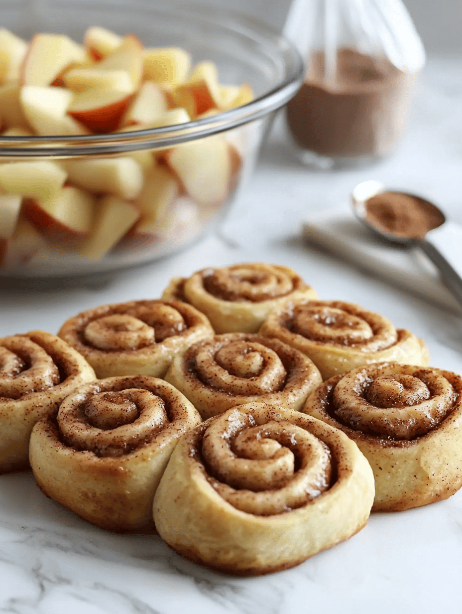 Place the cinnamon rolls on top of the apple layer, arranging them closely together so they touch but don’t overlap excessively.