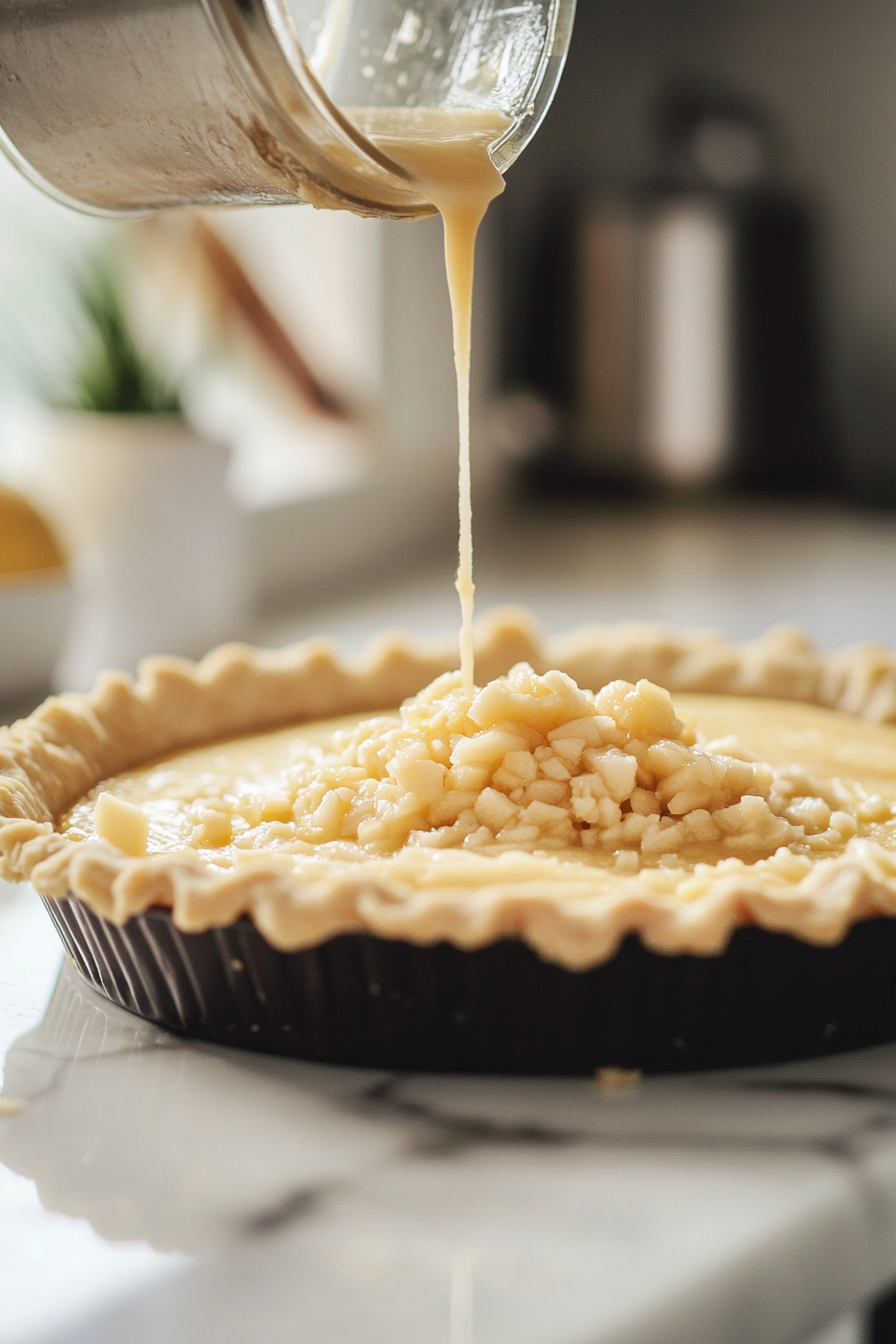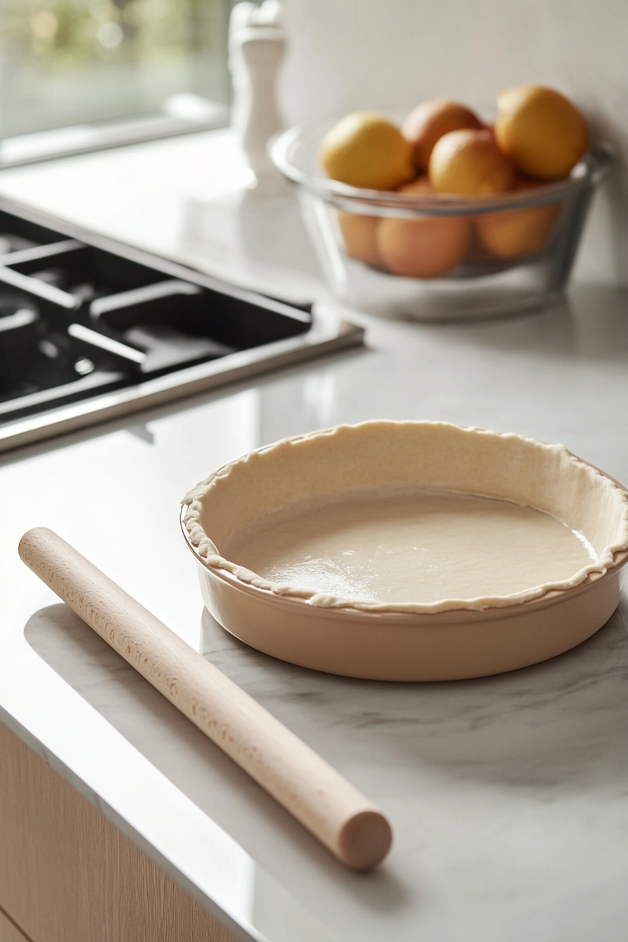 Roll out chilled pie dough into a 12-14 inch circle and place in a 9-inch pie dish. Trim excess dough and crimp the edges. Freeze while preparing the filling.